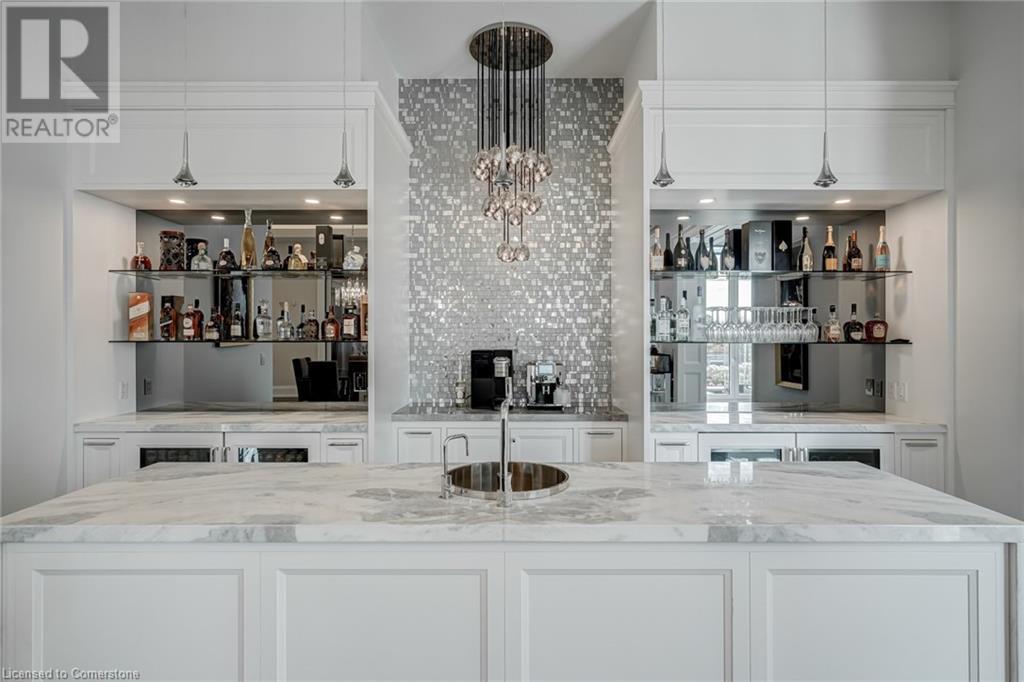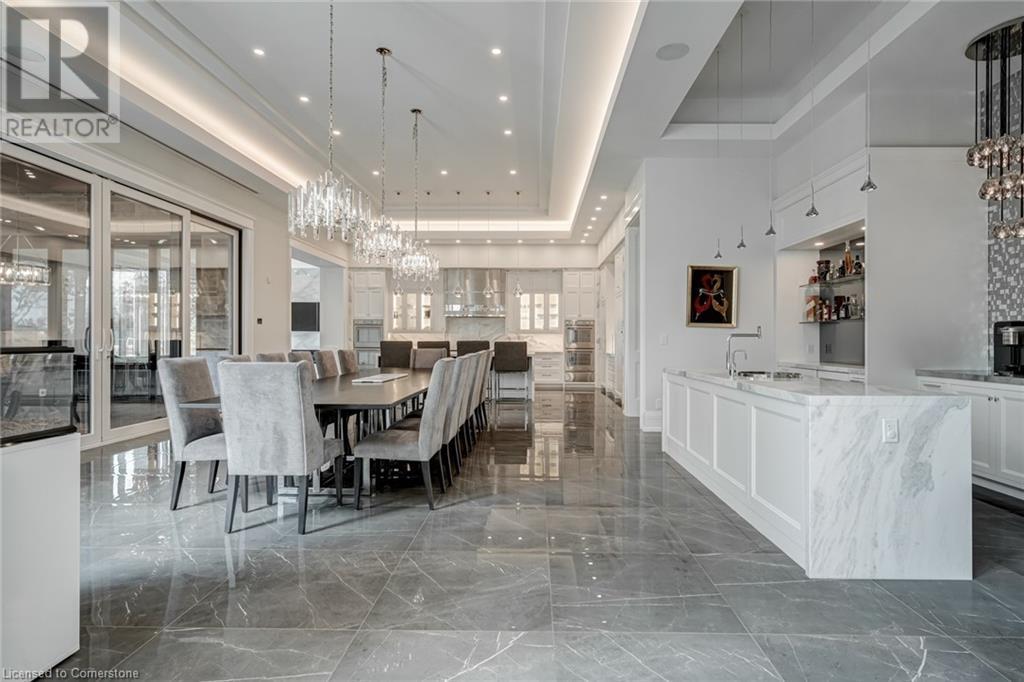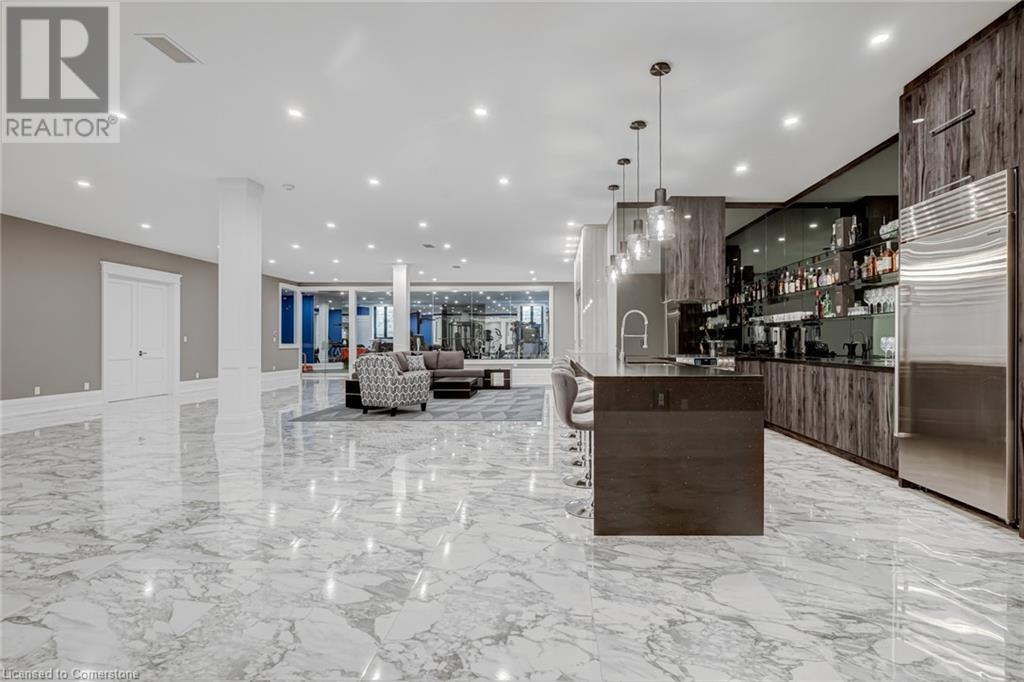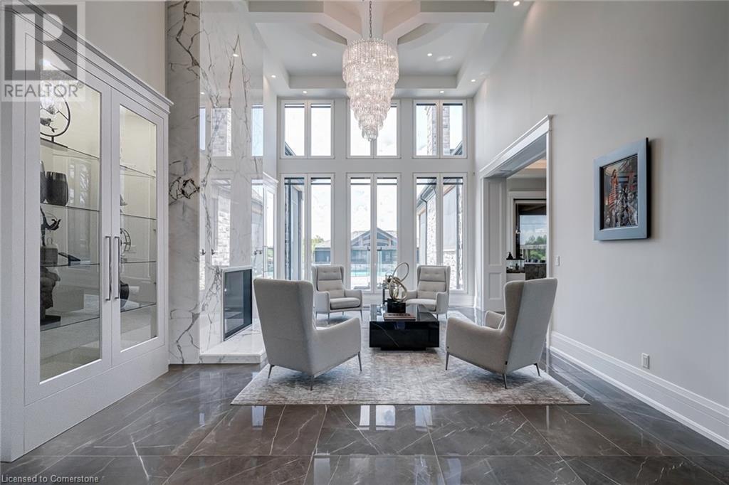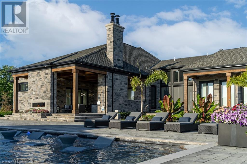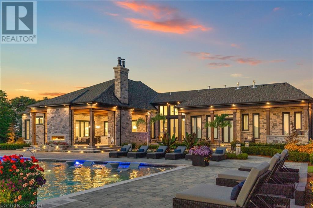 Set amidst a 5.2-acre estate, this extraordinary 26,000+ sq ft mansion offers unparalleled luxury and privacy. The gated and secured property features a stunning 1/3-acre aerated pond leading to a sprawling contemporary bungalow with lofted in-law quarters and a 5,210 sq ft detached garage with lounge, wash bay, and private gas pumpâideal for car enthusiasts.Surrounded by serene countryside, yet minutes from the heart of Ancaster, the renowned Hamilton Golf & Country Club, and Highway 403, offering both seclusion and convenience. Inside, every room showcases soaring 14 to 18-foot custom moulded ceilings, 32-inch porcelain flooring, and the highest quality materials and craftsmanship. The state-of-the-art home features whole-home automation by Control4. Spacious living areas feature custom granite walls with Town & Country fireplaces. A gourmet kitchen is equipped with top-tier appliances, including Sub-Zero, Thermador, and Miele. The luxurious lanai is perfect for entertaining, with heated Eramosa flagstone, a full outdoor kitchen, 72â Woods gas fireplace, and phantom screens. The opulent primary suite includes a private patio with hot tub and an expansive dressing room. The ensuite features heated herringbone floors, a soaker tub with fireplace, towel warmer drawers and a digital rain shower. The opposite wing offers three additional bedroom suites, each with walk-in closets and ensuites. A Cambridge elevator provides access to the entertainerâs dream basement, with a party room, full bar, professional gym with sauna and steam shower, games room, and a state-of-the-art home theatre. This 24-seat Dolby Atmos theatre features a 254-inch screen, 24-foot ceiling height, and a Kaleidoscope movie server for the ultimate cinematic experience. Outdoor amenities include a 35â x 75â heated pool, a 14-person hot tub, and an entertainment cabana with a media area and hosting bar. A regulation-size sports court and a childrenâs playground complete this family-friendly estate. (id:59398)