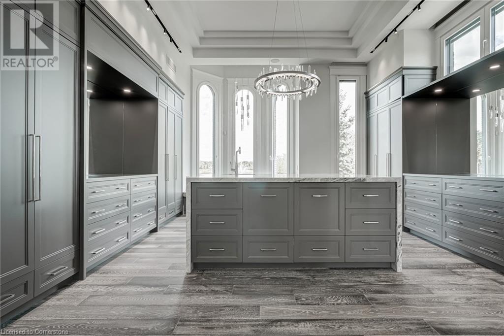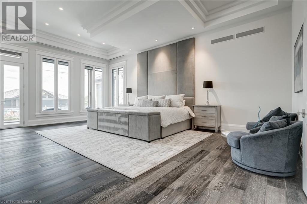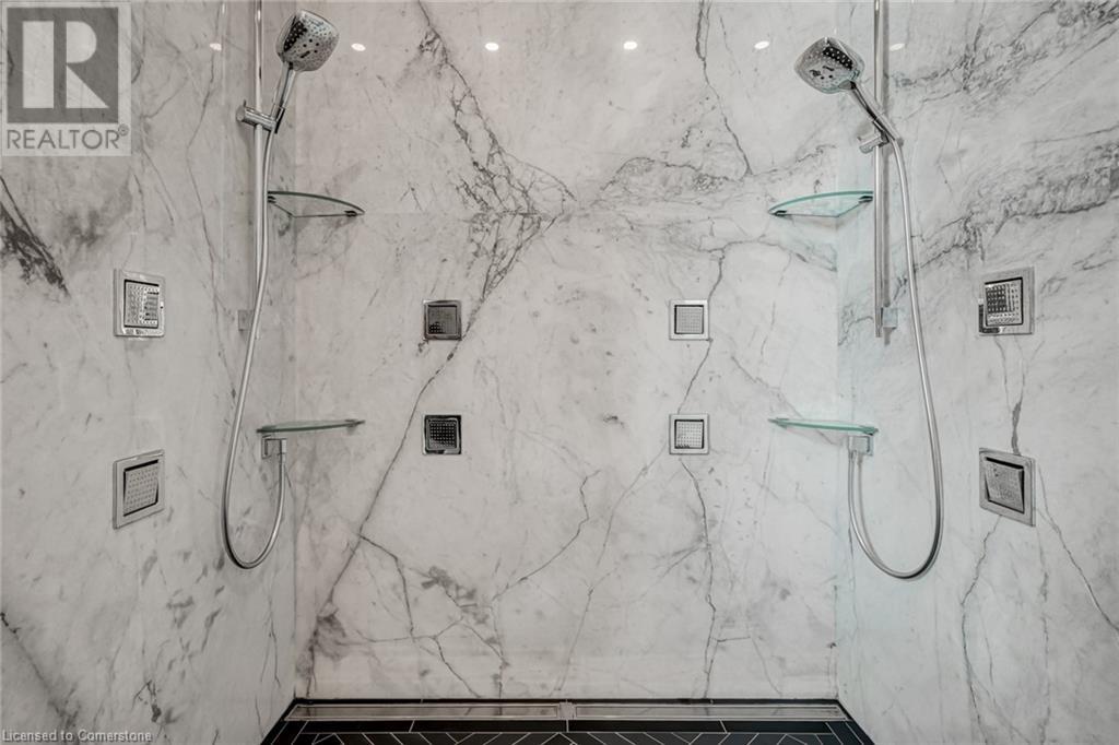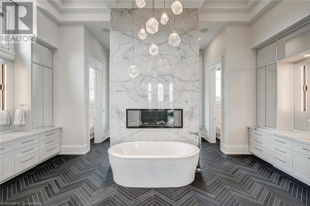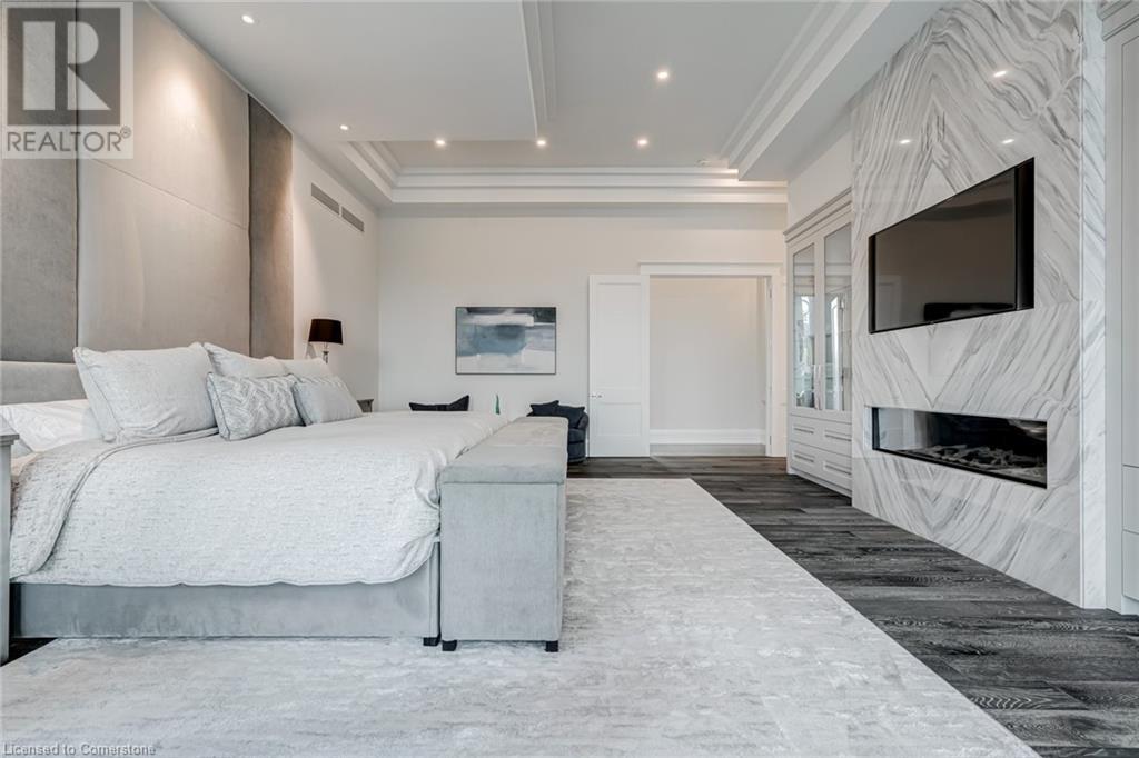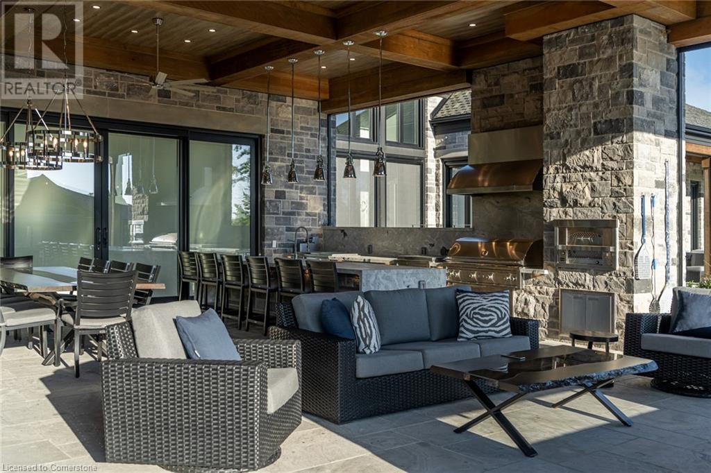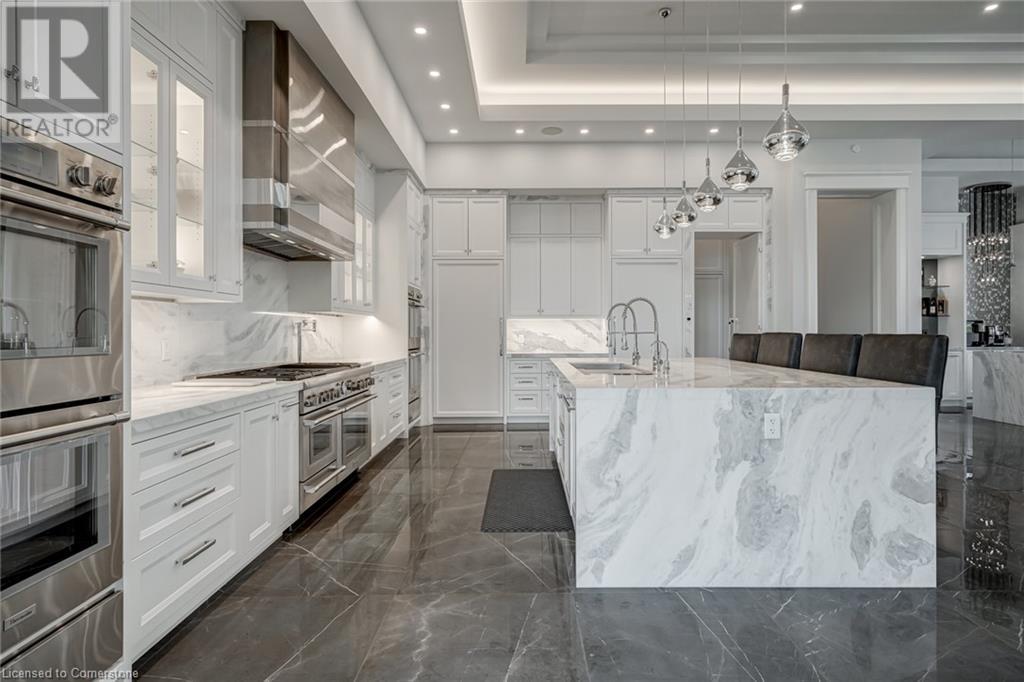 Set amidst a 5.2-acre estate, this extraordinary 26,000+ sq ft mansion offers unparalleled luxury and privacy. The gated and secured property features a stunning 1/3-acre aerated pond leading to a sprawling contemporary bungalow with lofted in-law quarters and a 5,210 sq ft detached garage with lounge, wash bay, and private gas pumpâideal for car enthusiasts.Surrounded by serene countryside, yet minutes from the heart of Ancaster, the renowned Hamilton Golf & Country Club, and Highway 403, offering both seclusion and convenience. Inside, every room showcases soaring 14 to 18-foot custom moulded ceilings, 32-inch porcelain flooring, and the highest quality materials and craftsmanship. The state-of-the-art home features whole-home automation by Control4. Spacious living areas feature custom granite walls with Town & Country fireplaces. A gourmet kitchen is equipped with top-tier appliances, including Sub-Zero, Thermador, and Miele. The luxurious lanai is perfect for entertaining, with heated Eramosa flagstone, a full outdoor kitchen, 72â Woods gas fireplace, and phantom screens. The opulent primary suite includes a private patio with hot tub and an expansive dressing room. The ensuite features heated herringbone floors, a soaker tub with fireplace, towel warmer drawers and a digital rain shower. The opposite wing offers three additional bedroom suites, each with walk-in closets and ensuites. A Cambridge elevator provides access to the entertainerâs dream basement, with a party room, full bar, professional gym with sauna and steam shower, games room, and a state-of-the-art home theatre. This 24-seat Dolby Atmos theatre features a 254-inch screen, 24-foot ceiling height, and a Kaleidoscope movie server for the ultimate cinematic experience. Outdoor amenities include a 35â x 75â heated pool, a 14-person hot tub, and an entertainment cabana with a media area and hosting bar. A regulation-size sports court and a childrenâs playground complete this family-friendly estate. (id:59398)