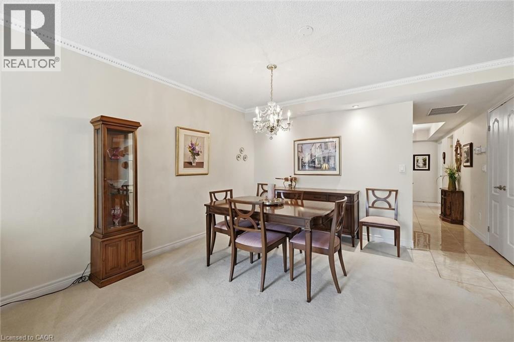 Spacious Corner Suite Overlooking Spencer Creek - 77 Governorâs Road, Dundas, Unit 207. Welcome to The Spencer Creek Village - built as one of Canada's most energy-efficient boutique condominiums, surrounded by nature and community. This 1,638 sq. ft. corner suite offers a thoughtful layout with a welcoming foyer and hall. The bright, open-concept formal living and dining areas are separated by pocket doors to the kitchen and den and framed by oversized picture windows with serene views of trees, gardens, and the creek below. Elegant crown moulding, a crystal chandelier, ceiling fan, polished floor tile, and custom blinds are just a few of the luxury upgrades. Enjoy a sunny, airy kitchen with a walk-out to the balcony, ceramic floors and backsplash, custom cabinetry, under-counter lighting, built-in desk, full-length pantries, double sink with garburator and instant hot water, and a large centre island open to the extended eating area filled with natural light for casual dining. The den, with its commanding views of the conservation area, is perfect for an office or TV room, while the spacious primary bedroom includes a large walk-in closet and full ensuite with a generous linen closet. A second bedroom, also with a walk-in closet, and an additional bathroom offer flexibility for guests or family. Additional features include two underground parking spaces, a private storage unit, in-suite laundry, and abundant closet space. The second-floor location allows access by elevator or stairs via the secure entry system. This well-maintained building offers beautiful landscaping, visitor parking, central air conditioning, a fitness room, sauna, guest suite, library, gathering lounge, and outdoor BBQ - all steps from nature trails and downtown Dundas conveniences. A rare opportunity to relocate without compromise - surrounded by comfort, quiet, and community. (id:59398)